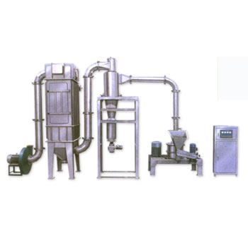 物料由料斗經(jīng)螺旋輸送器進(jìn)入粉碎室,被高速旋轉(zhuǎn)的刀片剪切粉碎,通過負(fù)壓風(fēng)運(yùn)的方法把物料運(yùn)入旋風(fēng)分離器、袋式除塵器、排出物料達(dá)到產(chǎn)品的要求。